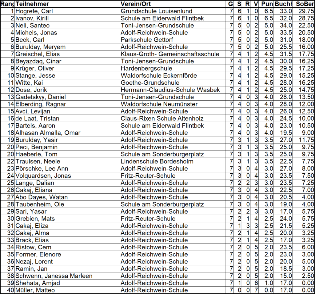 Insgesamt 40 Teilnehmer hatten wir bei den Grundschülern. Das Ergebnis war sehr knapp, die Plätze 1-6 wurden durch die Buchholz-Wertung bestimmt.